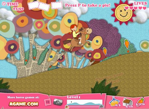 Do you like riding horses? What about ponies? They are smaller, lower and have a funny look that perfectly fits the overall style of our new online game under the title Pony Adventure. It's a frivolous, mere entertainment with nice colorful collage-like graphic, which would easily take your mind into the world of incredible adventures, exciting chases and relaxing ambience. Your main goal is to collect carrots, pictures and other items, what appear on your way, at the same time avoiding numerous stumps, rocks and dips. Just open Pony Adventure and you immediately will be able to play it online in the window of your browser! Enjoy funny horseback riding!
